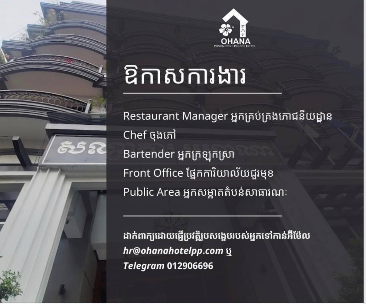 OHANA Phnom Penh Palace Hotel ខាងយើងខ្ញុំកំពុងជ្រើសរើសបុគ្គលិកជាច្រើនផ្នែកដូចជា៖