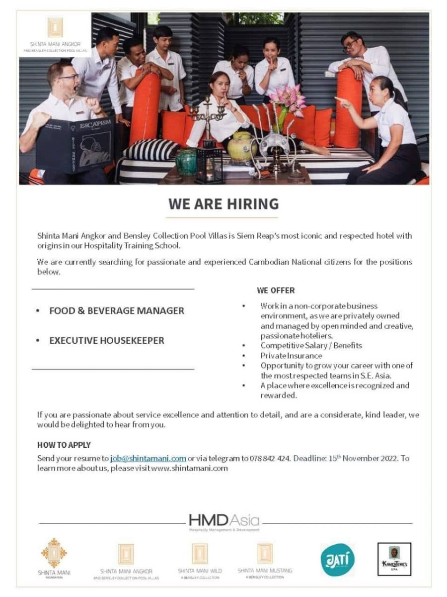 សណ្ឋាគារ Shinta Mani Angkor ត្រូវការជ្រេីសរេីសបុគ្គលិកជាច្រើនរូប សម្រាប់មុខតំណែងដូចខាងក្រោម ៖