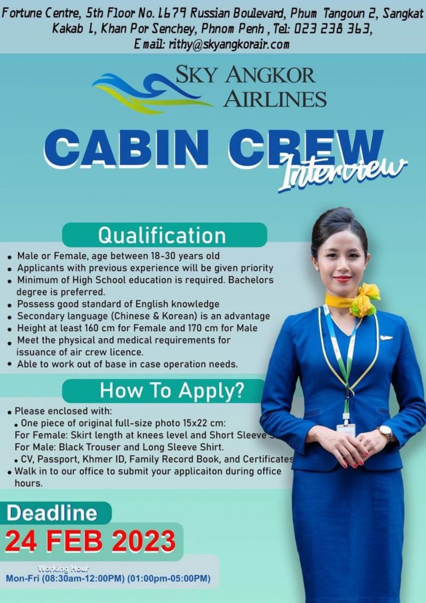 ក្រុមហ៊ុន Sky Angkor Airlines កំពុងត្រូវការជ្រើសរើសបុគ្គលិកផ្នែក Cabin Crew