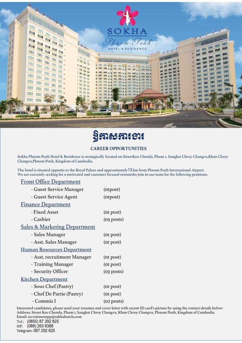 Sokha Phnom Penh Hotel & Residence កំពុងត្រូវការជ្រើសរើសបុគ្គលិកផ្នែក៖: