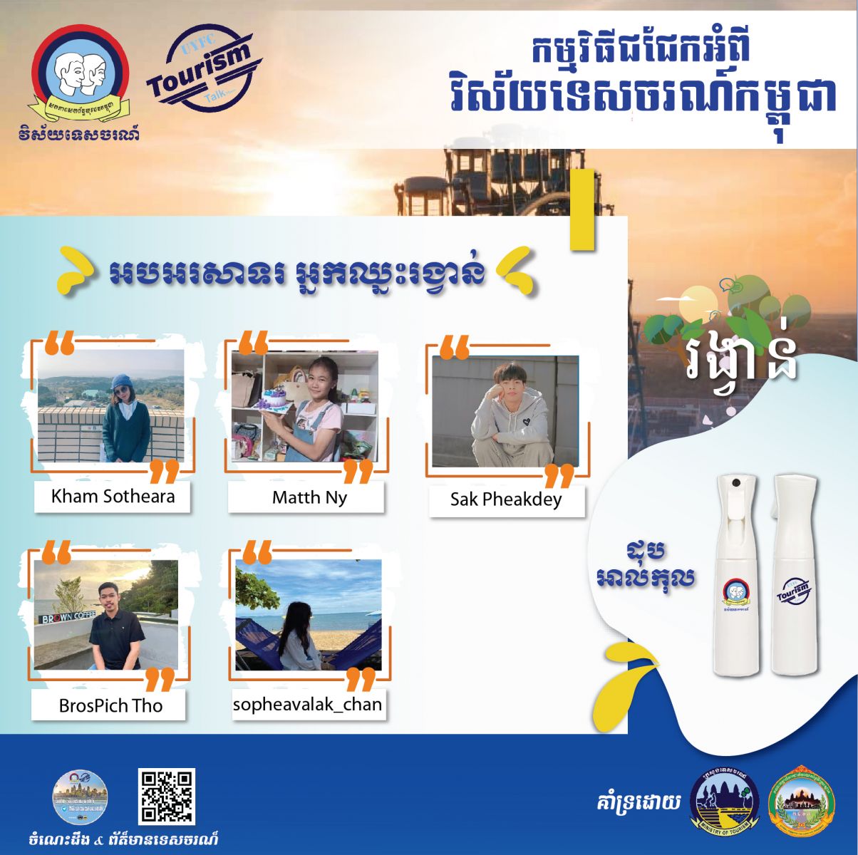 បញ្ជាក់៖ សម្រាប់អ្នកឈ្នះរង្វាន់ សូមផ្ញើសារ (Inbox) មកកាន់ផេករបស់សហភាពសហព័ន្ធយុវជនកម្ពុជា វិស័យទេសចរណ៍ ដើម្បីទទួលបានព័ត៌មានបន្ថែម។