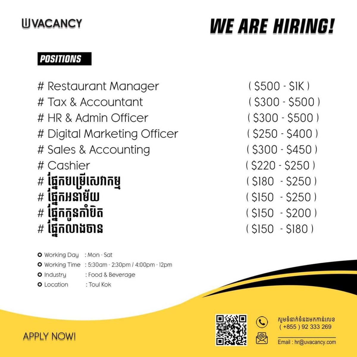 ក្រុមហ៊ុន VACANCY! ត្រូវការជ្រើសរើសបុគ្គលិកច្រើនផ្នែកដូចខាងក្រោម៖