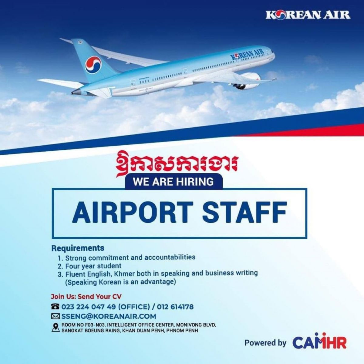Korean Air កំពុងត្រូវការជ្រើសរើសបុគ្គលិកច្រើនផ្នែក Airport Staffs បន្ទាន់ ៖