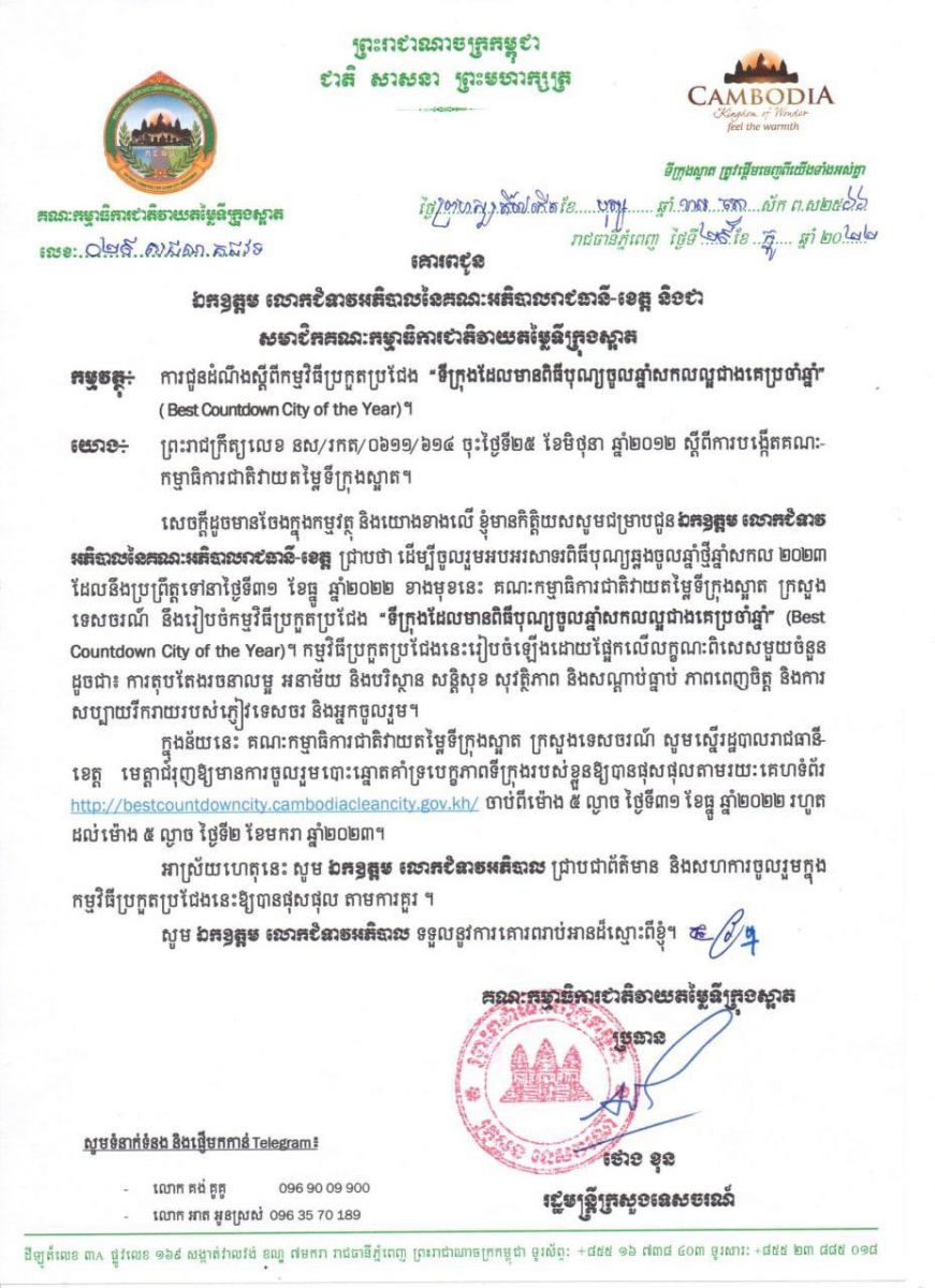 (ភ្នំពេញ)៖ គណៈកម្មាធិការជាតិវាយតម្លៃទីក្រុងស្អាត និងក្រសួងទេសចរណ៍ នឹងរៀបចំកម្មវិធីប្រកួតប្រជែង «ទីក្រុងដែលមានពិធីបុណ្យចូលឆ្នាំសកលល្អជាងគេប្រចាំឆ្នាំ ២០២២» (Best Countdown City of The Year 2022)។