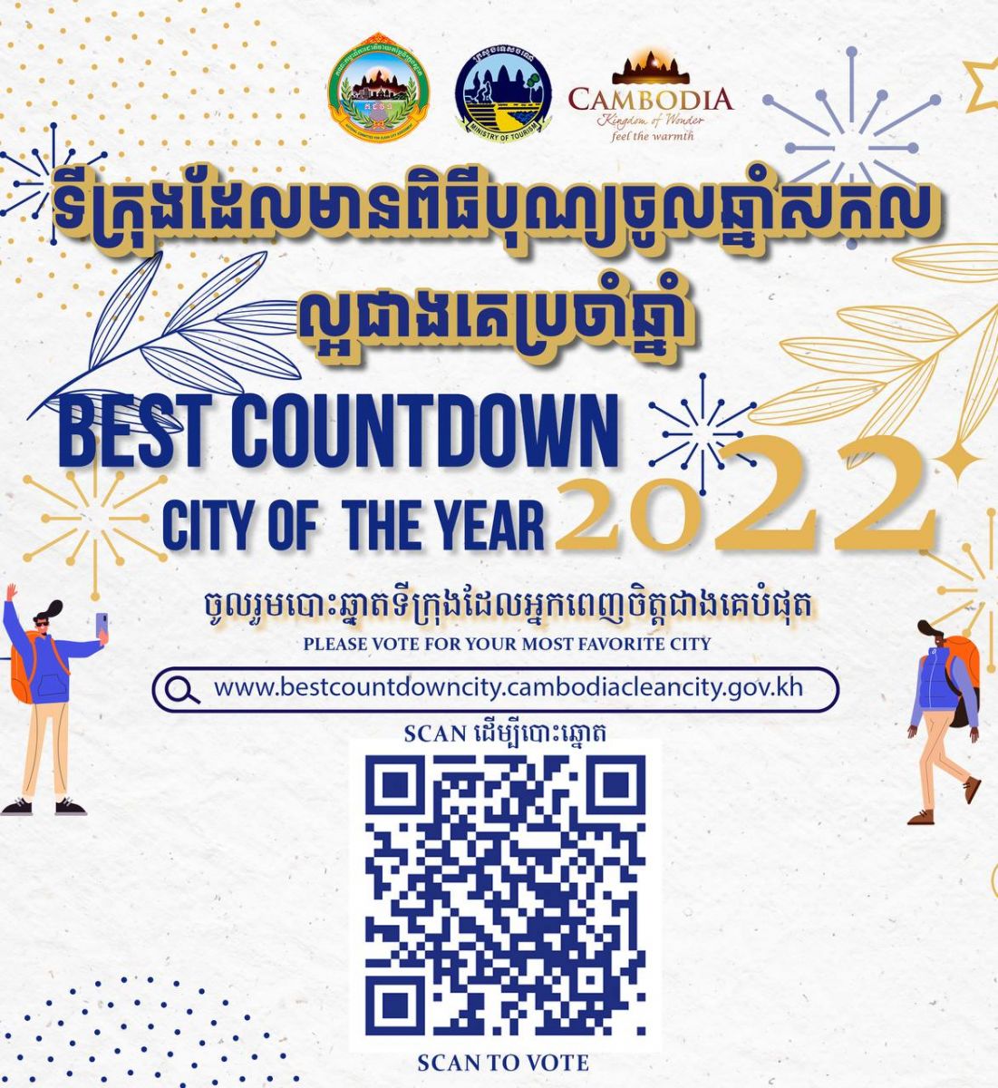 ប្រជាពលរដ្ឋ ក៏ដូចជាភ្ញៀវទេសចរជាតិ និងអន្តរជាតិ អាចចូលរួមធ្វើការបោះឆ្នោតគាំទ្រទីក្រុង ដែលលោកអ្នកពេញចិត្តជាងគេបំផុត ដោយជ្រើសរើសតែ ១ ប៉ុណ្ណោះ ចាប់ពីម៉ោង ៥ល្ងាច ថ្ងៃទី៣១ ខែធ្នូ ឆ្នាំ២០២២ រហូតដល់ថ្ងៃទី០២ ខែមករា ឆ្នាំ២០២៣ (ត្រឹមម៉ោង ៥ល្ងាច) តាមរយៈគេហទំព័រ៖ http://bestcountdowncity.cambodiacleancity.gov.kh៕