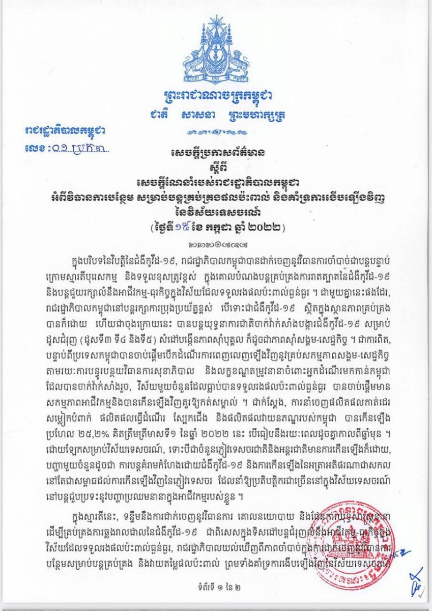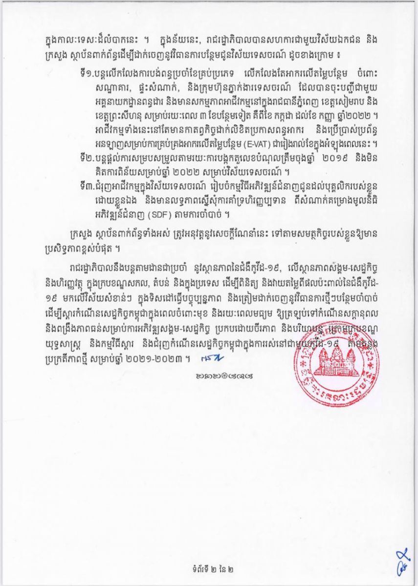 រាជរដ្ឋាភិបាលសម្រេចបន្តលើកលែងពន្ធប្រចាំខែគ្រប់ប្រភេទ លើកលែងតែVAT ចំពោះសណ្ឋាគារ ផ្ទះសំណាក់ និងក្រុមហ៊ុនភ្នាក់ងារទេសចរណ៍ រយៈពេល ៣ខែទៀត ពីខែកក្កដា ដល់ខែកញ្ញា ឆ្នាំ២០២២